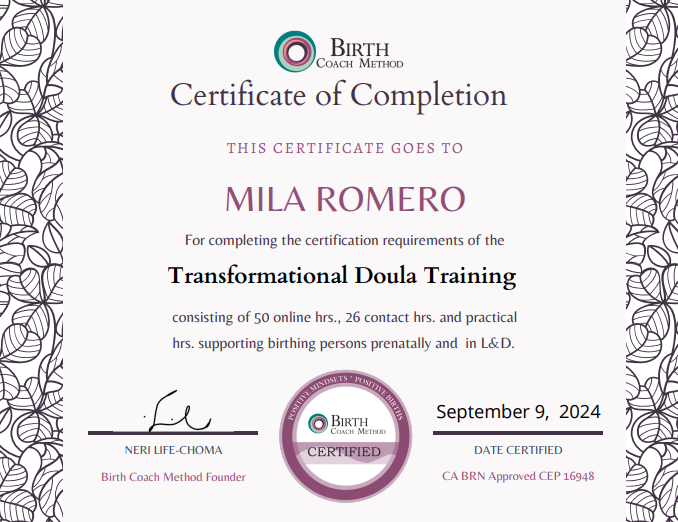 My name is Mila Romero I have completed my Doula In Training with Birth Coach Method founded by Neri Life-Choma. I have over 20 years’ experience working in Healthcare throughout the Peninsula.